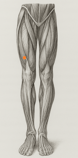 外側広筋の筋腹に相当し、押すと筋肉の緊張や痛みを感じやすい。