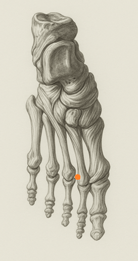 足背、第2中足指節関節の後方、外側のくぼみ。