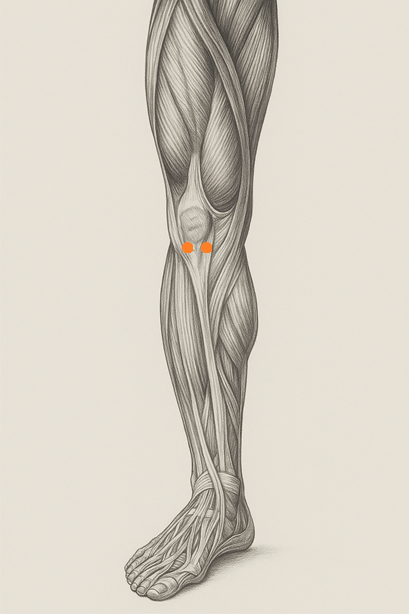 膝眼は、膝蓋下脂肪体の血流を促し、膝関節前面の「気滞血瘀(きたいけつお)」を解除する働きを持つ。