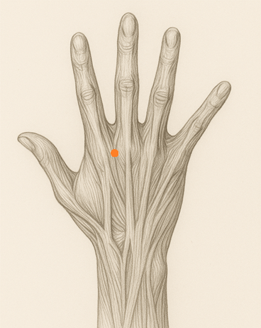 手背にあり、第2・第3中手指節関節間の上約5分(第2・第3中手骨の間)に取る。